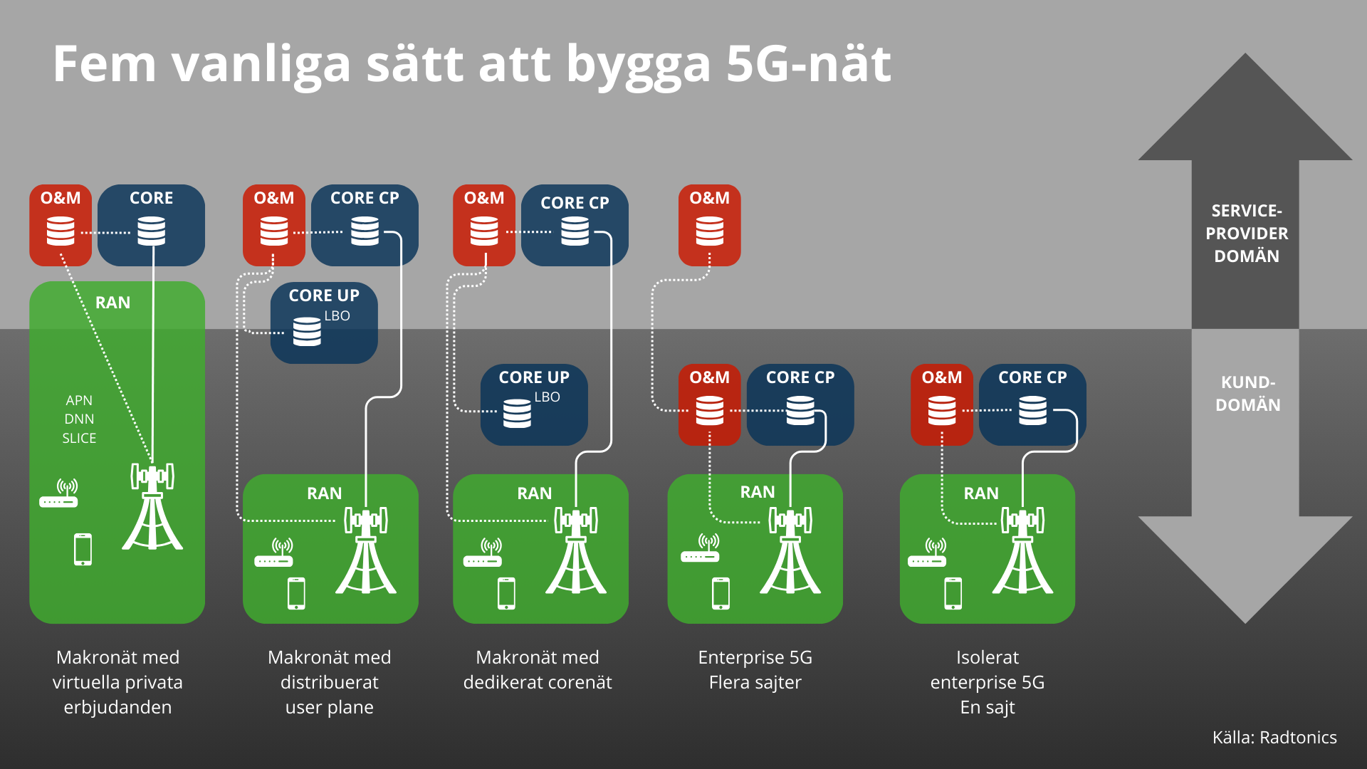 Det finns fem olika sätt att bygga 5G-nät på menar Oscar Bexell, Radtonics, och hänvisar till nedanstående modell.