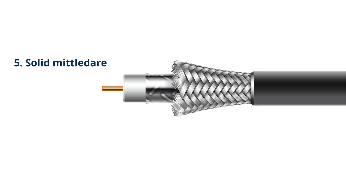 Den solida mittledaren är kärnan i antennkabeln och dess funktion är att transportera signalen mellan antennkontakterna. Kärnan är vanligtvis gjord av koppar och erbjuder låg resistans och hög ledningsförmåga, vilket är viktigt för effektiv signalöverföring. Kvaliteten och konstruktionen av mittledaren påverkar direkt kabelns prestanda, vilket gör den till en kritisk komponent i utformningen av antennkablar.