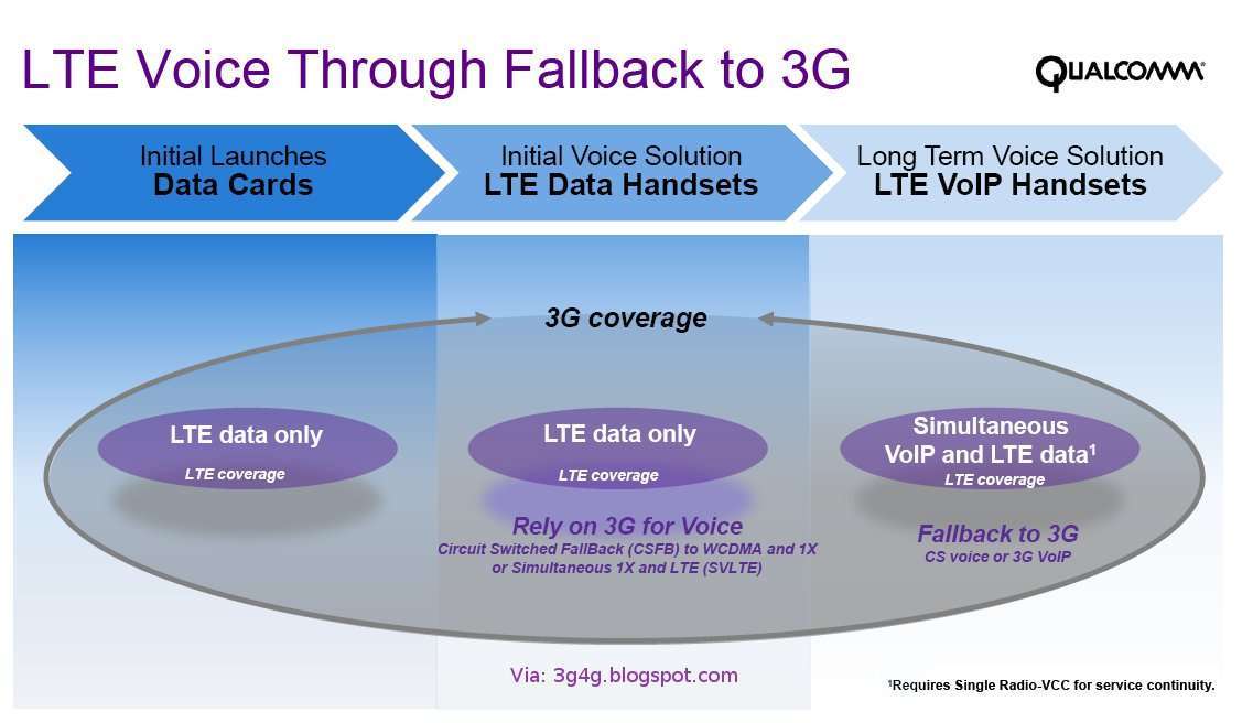 Vi tenderar att glömma bort att 4G kommer att implementeras i telefoner i samma utsträckning som 3G idag. Qualcomm har en bra bild som visar 4G utvecklingen från att erbjuda datatrafik via 4G modem, till att använda LTE för data och 3G för röstsamtal till att gå över till VoIP via LTE för röstsamtal och bara använda 3G som fallback.