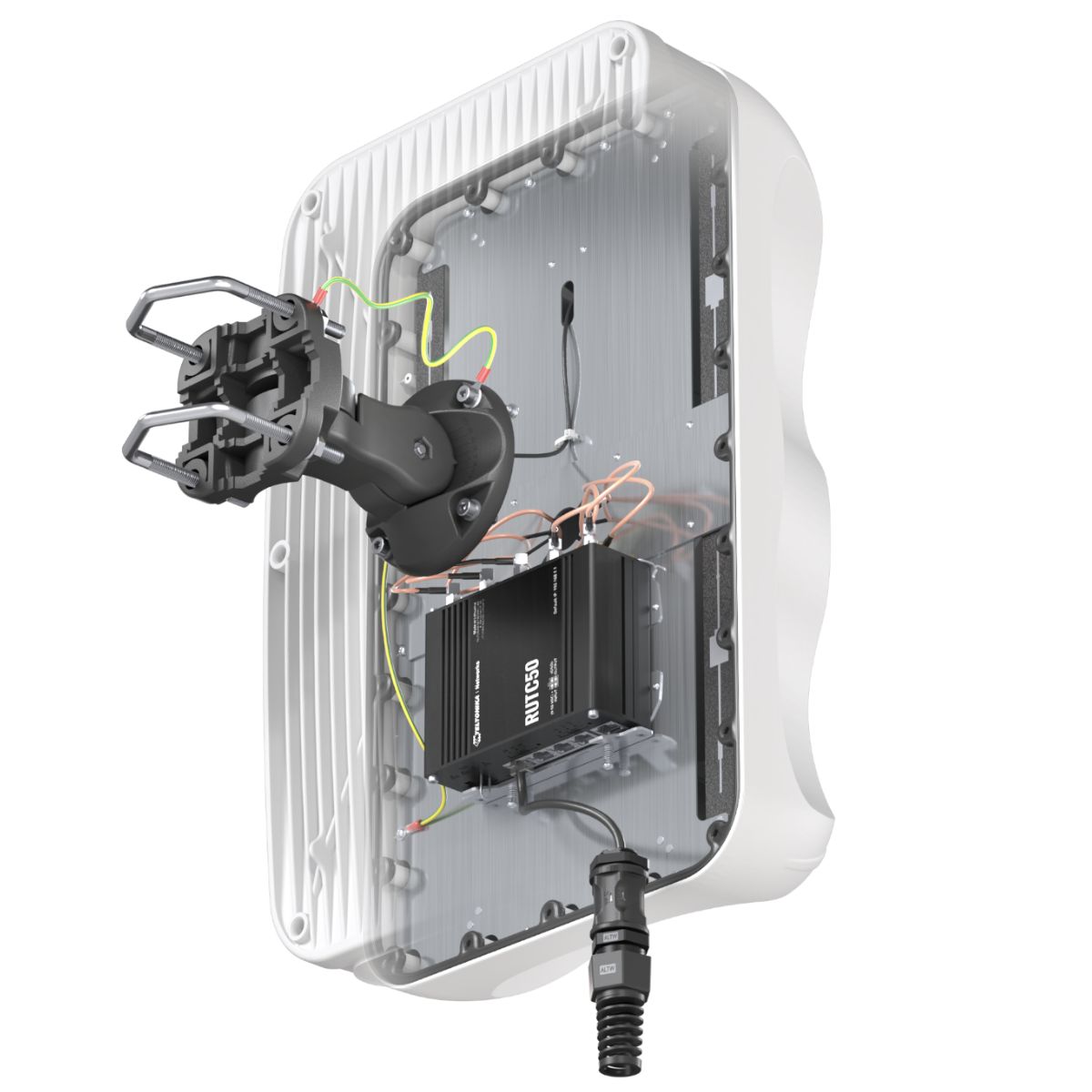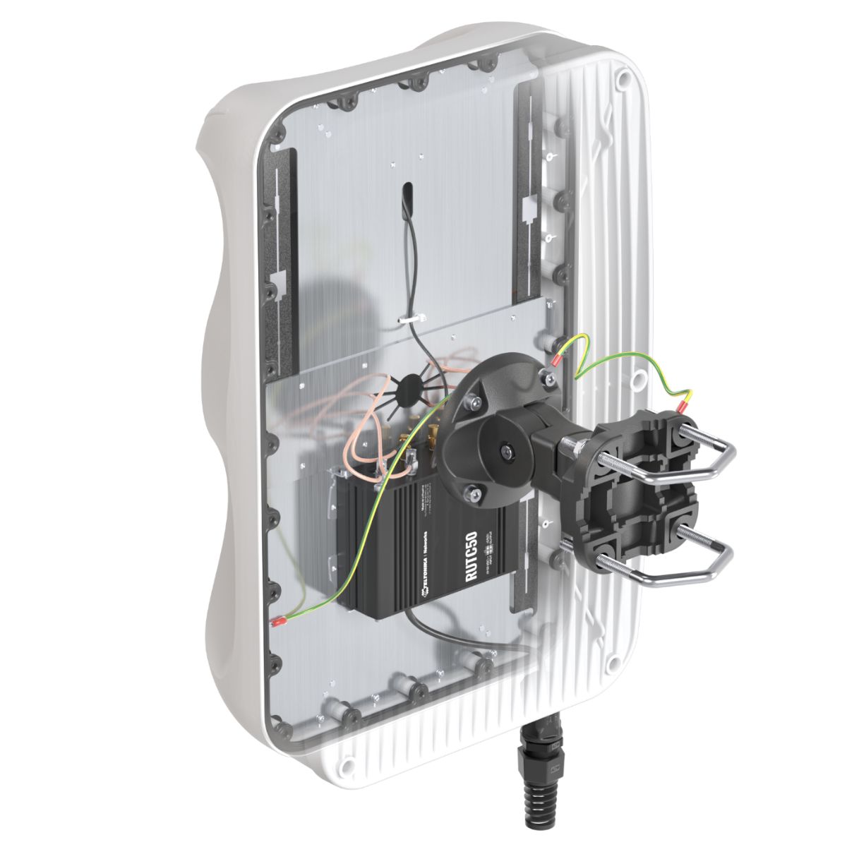 QuMax för Teltonika RUTC50 router är en perfekt kapsling för installation utomhus som passar framförallt fasta installationer. Den har två inbyggda Wi-Fi-antenner som stöder både 2,4 GHz och 5 GHz frekvensband. Om man använder RUTC50 med QuMax får man en högpresterande, komplett, integrerad lösning med en inbyggd router och en integrerad 4G/5G-antenn.