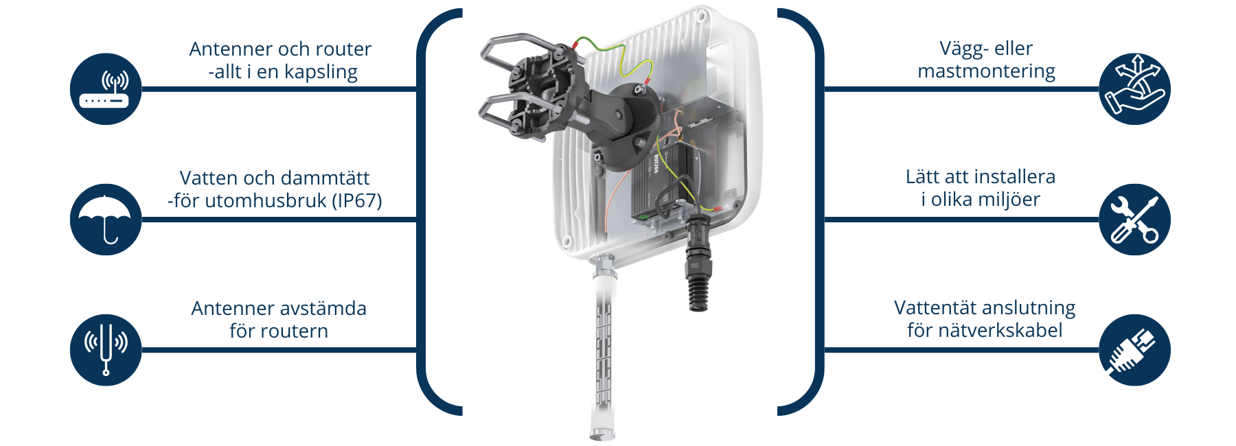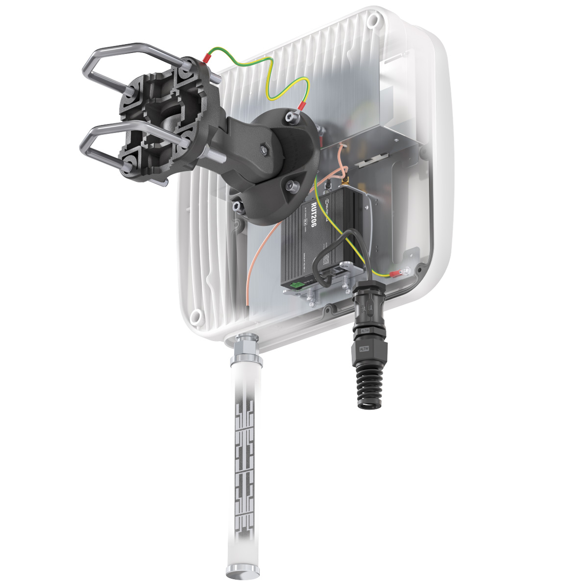 Robust kapsling med integrerad 4G-riktantenn samt en rundstrålande wifi-antenn, allt i en kompakt och prisvärd kapsling som även rymmer en router (Teltonika RUT206).