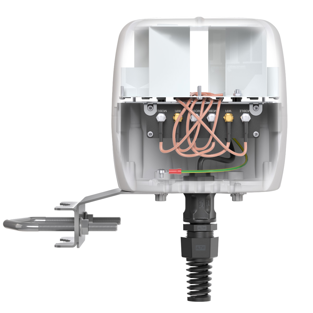 Robust kapsling med integrerad rundstrålande 4G/5G-antenn samt en rundstrålande wifi-antenn, allt i en kompakt och prisvärd kapsling som även rymmer en router (Teltonika RUTM30 eller RUTM31).
