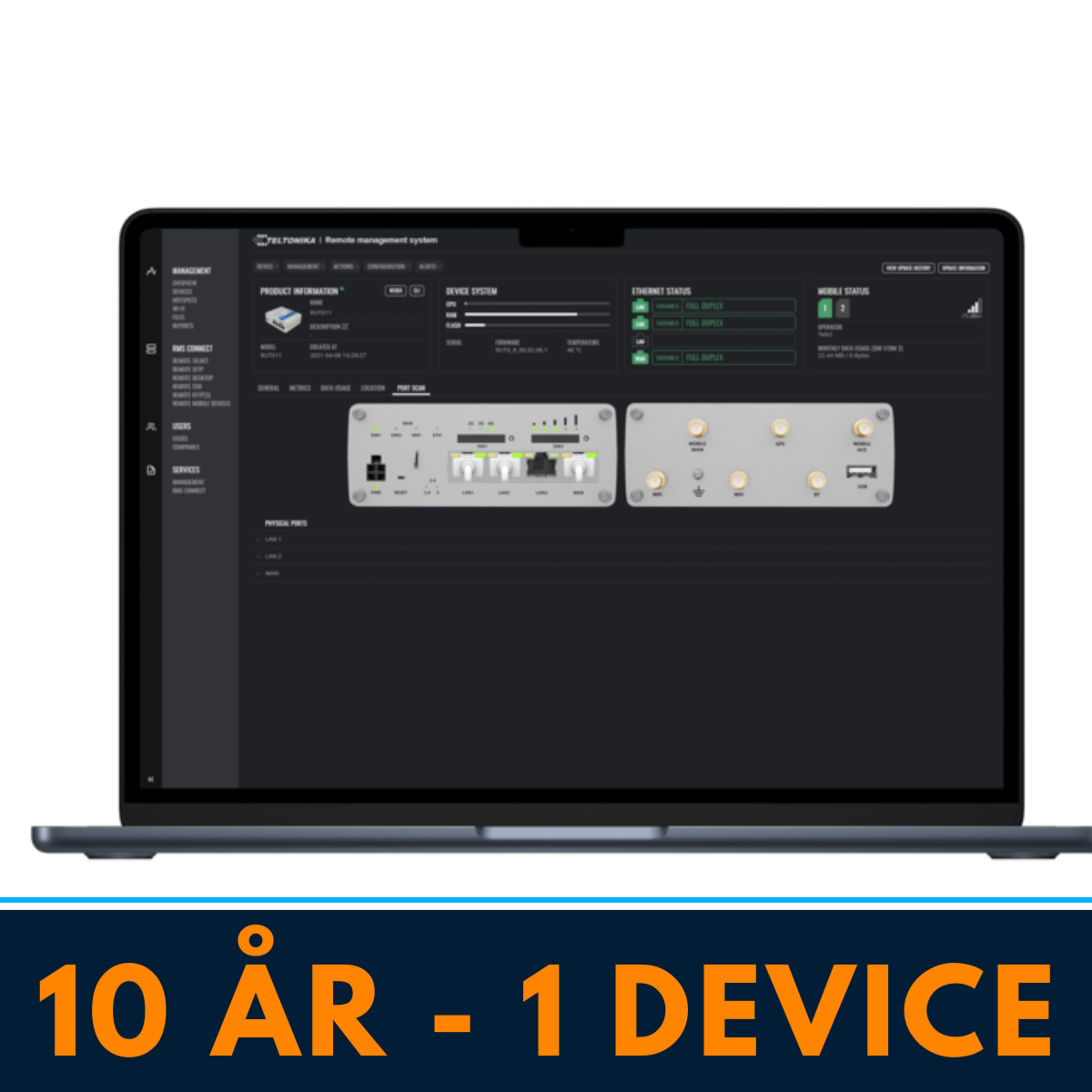 Remote Management System (RMS) är Teltonikas molntjänst för att övervaka och hantera routrar och gateways – helt utan publik IP-adress. En licens gäller en enhet i tio år från aktivering. Ingen extra kostnad för RMS-övervakning tillkommer under licensperioden.