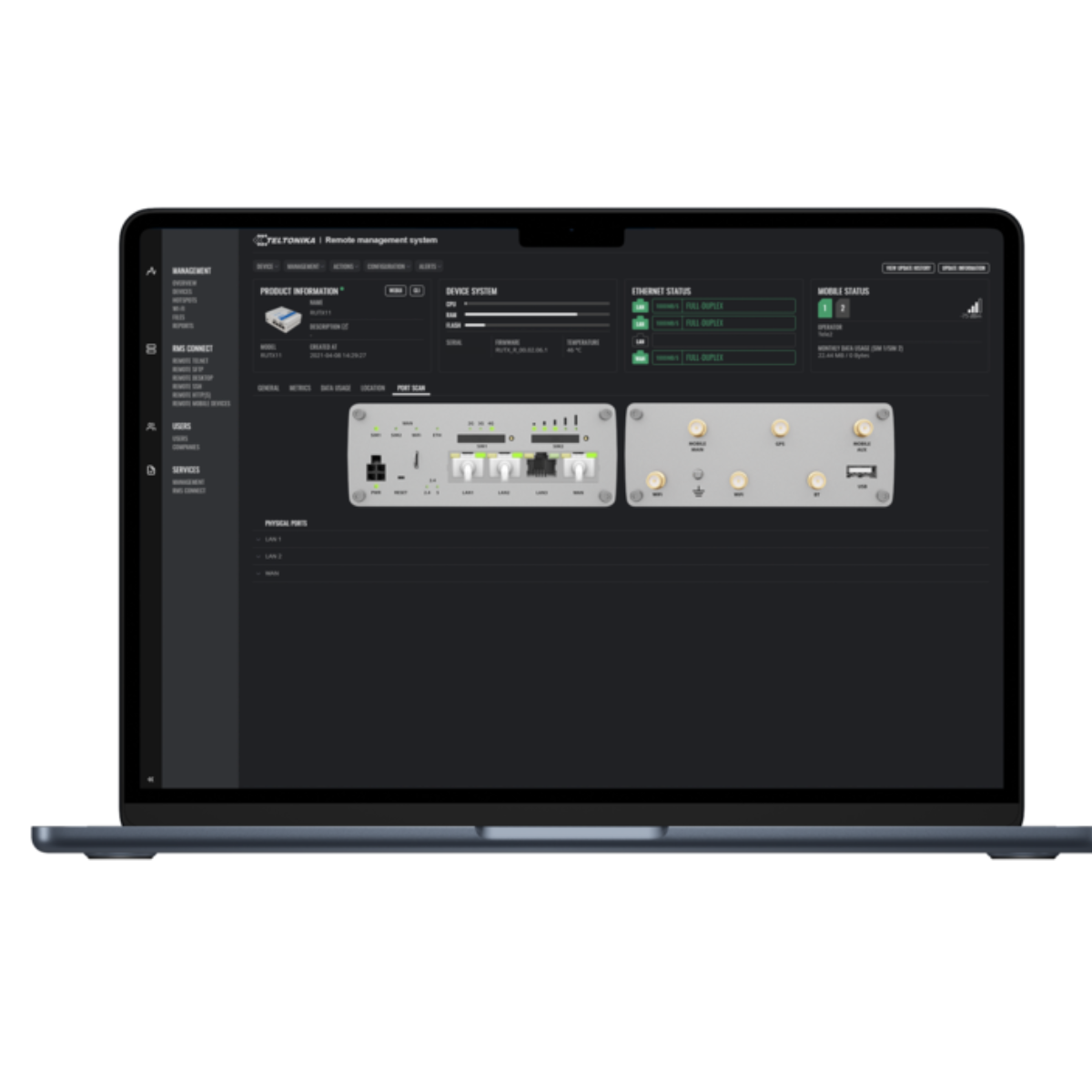 RMS ger dig ett webbaserat gränssnitt för att hantera alla dina Teltonika-enheter från ett ställe. Du kan konfigurera, övervaka och felsöka alla routrar och gateways – även utan publik IP-adress. Ingen lokal mjukvara krävs.
