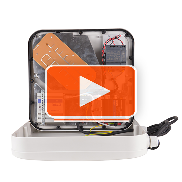 Routern och PoE-switchen spänningsmatas via två inbyggda PoE-nätaggregat som strömförsörjs direkt från ett vägguttag. En utomhusklassad kabel medföljer i leveransen.