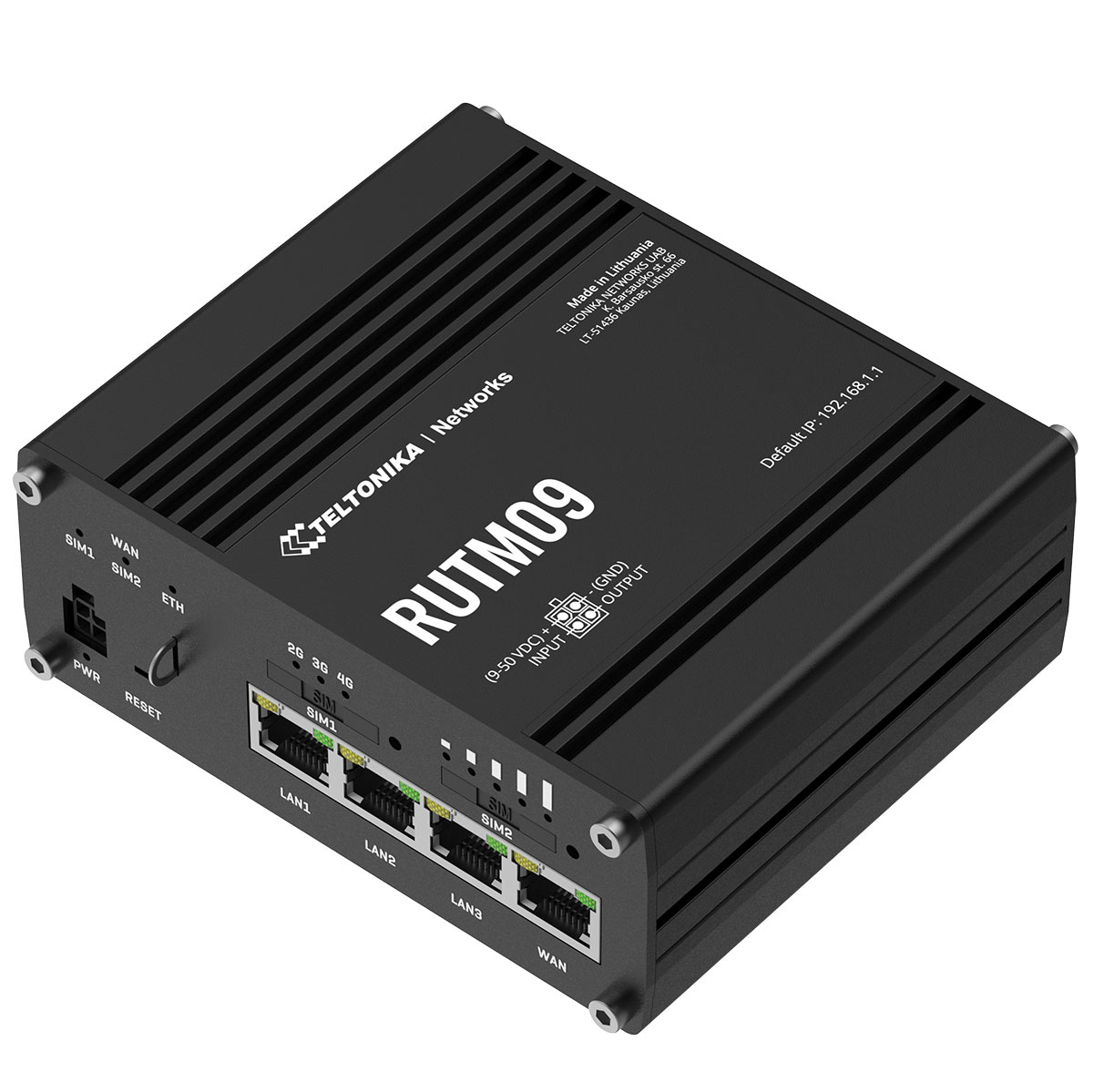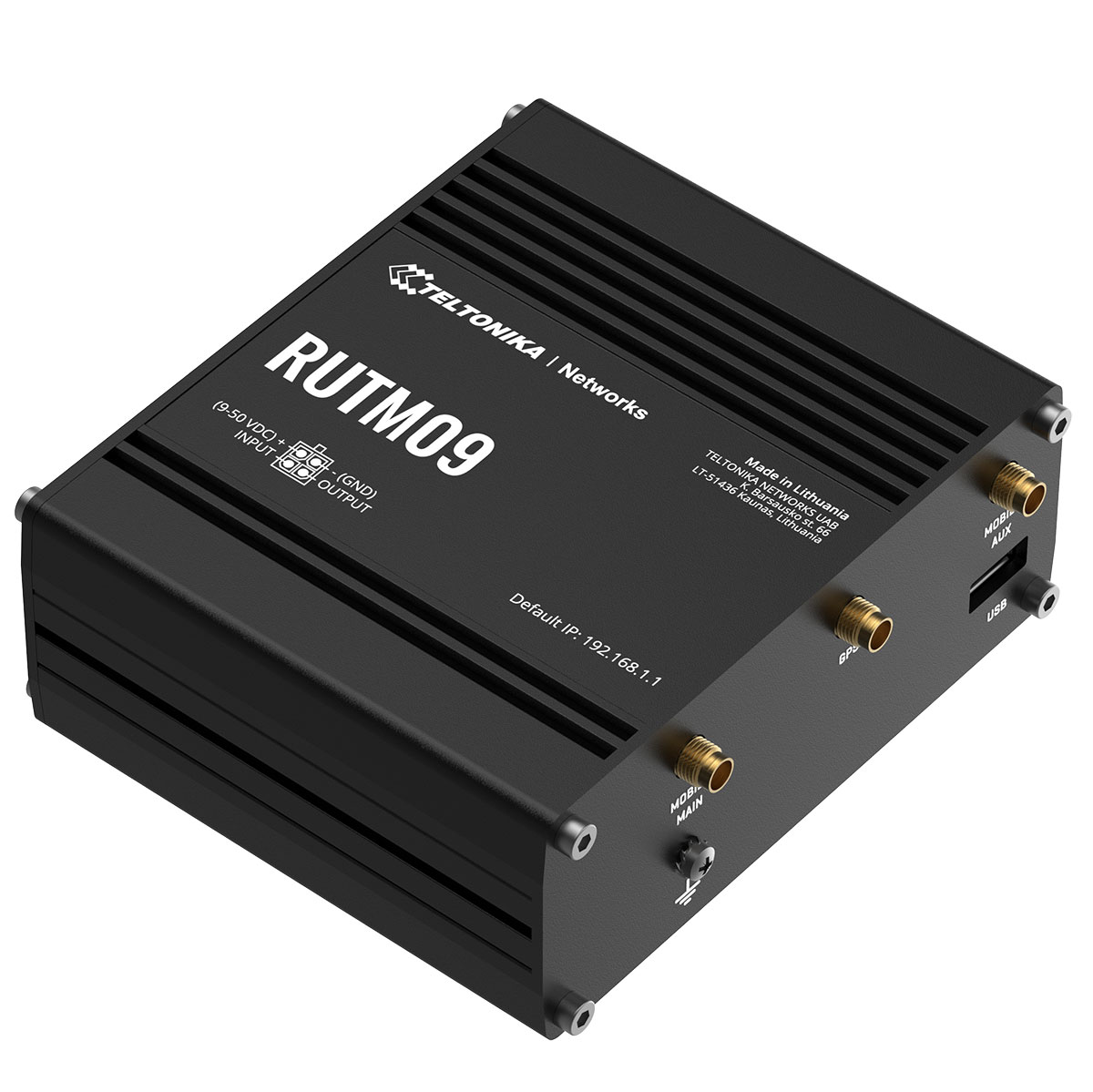 RUTM09 är en router helt i metall som är anpassad för de flesta installationsmiljöer, den påminner i stort om Teltonikas RUTX09. Den erbjuder ett brett inspänningsområde (9-50 VDC) och klarar externa påfrestningar som extrema temperaturer(-40°C – +75 °C). Routern spänningsmatas via det medföljande nätaggregatet eller via så kallad passiv PoE på LAN-port 1. Routern har också en I/O-port i spänningsmatningskontakten för övervakning av en sensor och styrning av en extern förbrukare, exempelvis kan denna utgång anslutas till ett relä.