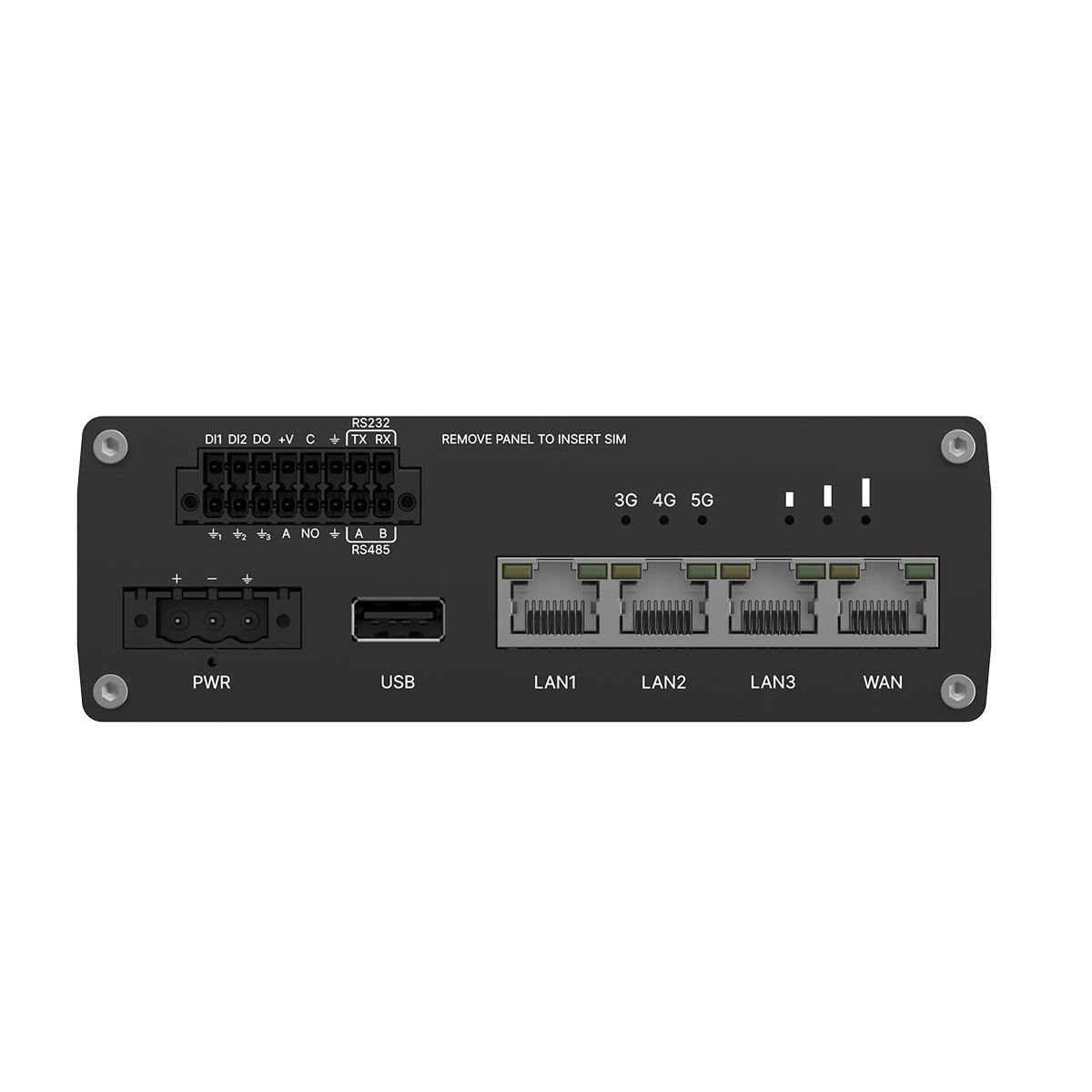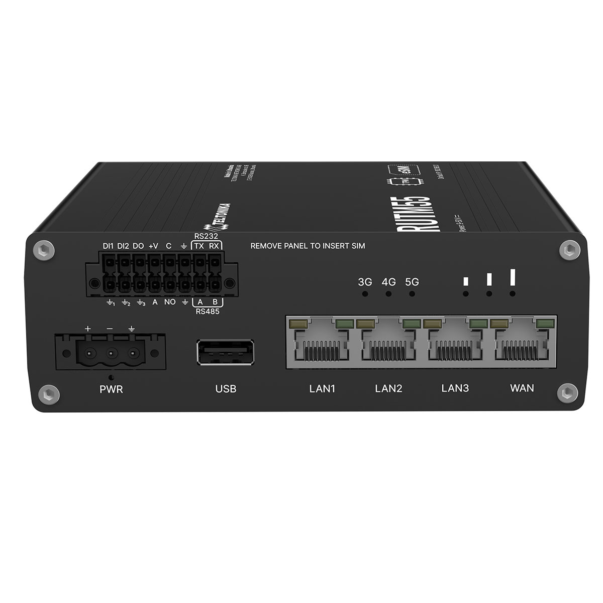 RUTM55 är en router med många anslutningsmöjligheter. Den har 5G med fallback till 4G (CAT 19), fyra Gigabit Ethernet-portar, RS232, RS485, USB och både digitala och analoga I/O.