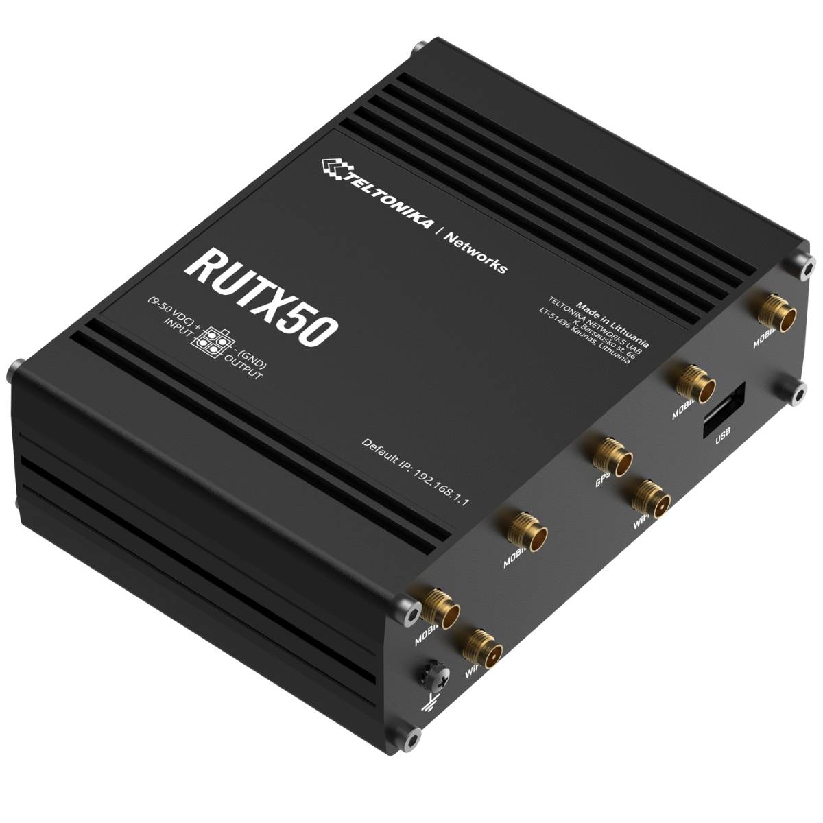 Teltonika RUTX50 är en kraftfull router inrymd i en aluminiumkapsling. Routern erbjuder höga hastigheter med upp till 3,3 Gbit/s. RUTX50 är utformad för lösningar där datahastighet och hög tillgänglighet behövs. RUTX50 har dubbla SIM-kortsplatser för att ge möjlighet till överkoppling till en andra operatör vid störningar, en funktion tänkt att maximera tillgängligheten för anslutningen. Routern har 4 x LAN portar med 10/100/1000 Mbit/s, 1 x WAN port (som kan användas som en femte LAN-port) med 10/100/1000 Mbit/s. Routerns snabba 5G-anslutning kan utnyttjas fullt ut då routern har stöd för både Gigabit Ethernet-portar för lokalt nätverk och ett snabbt trådlöst nätverk.