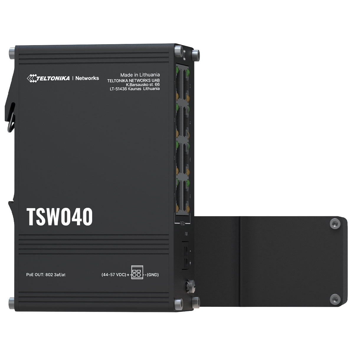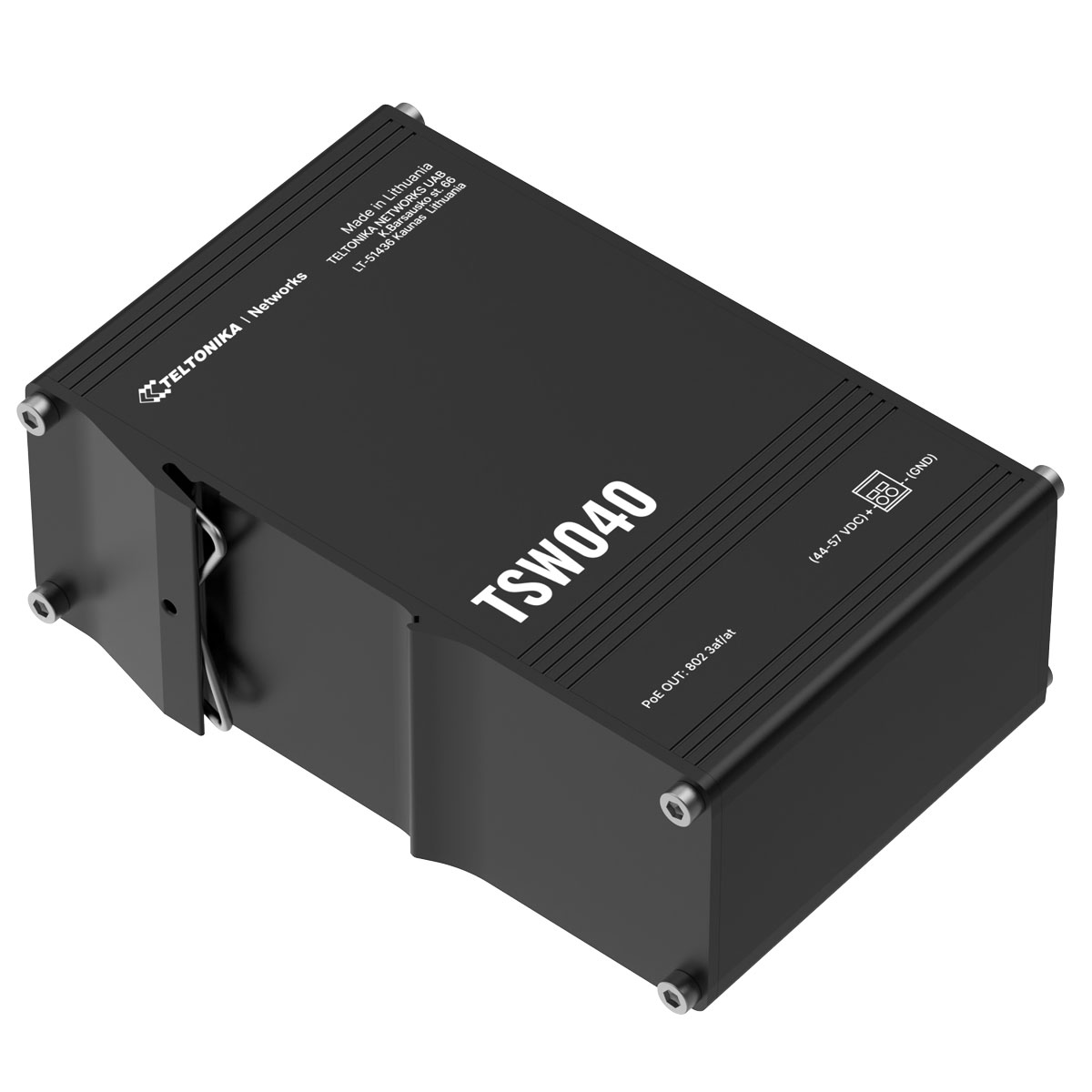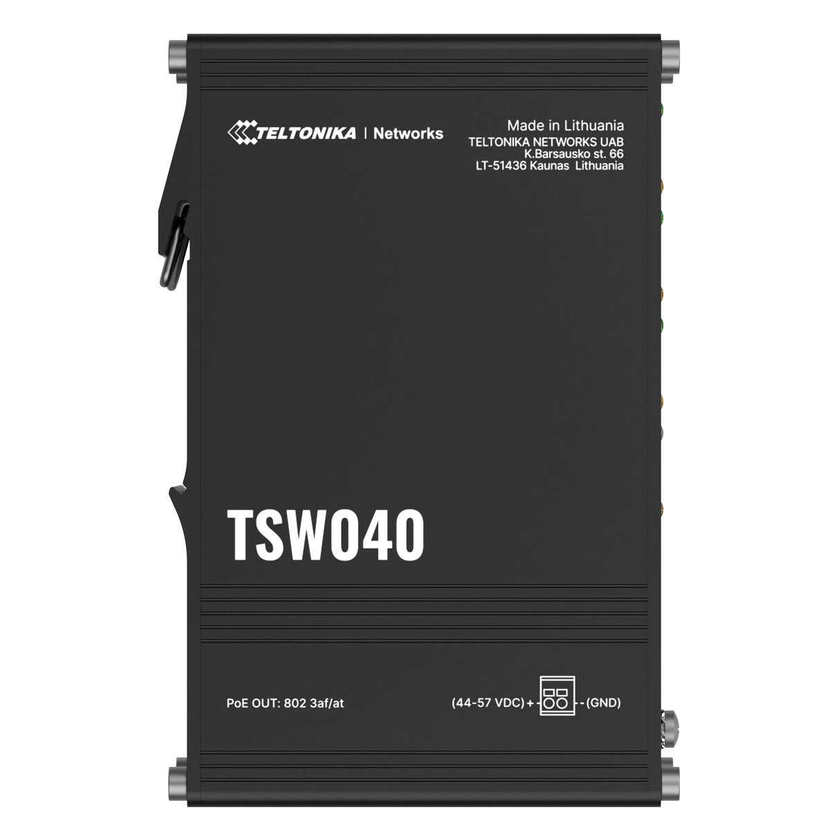 TSW040 är en industriell unmanaged switch från Teltonika Networks. TSW040 är utrustad med åtta 10/100 Ethernet-portar, PoE+/Power-over-Ethernet (PoE) ut på samtliga portar.