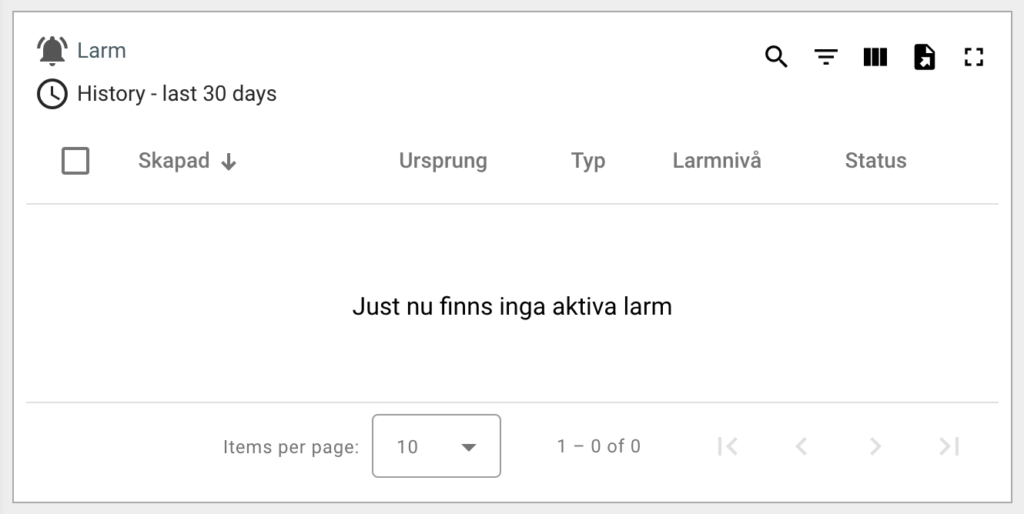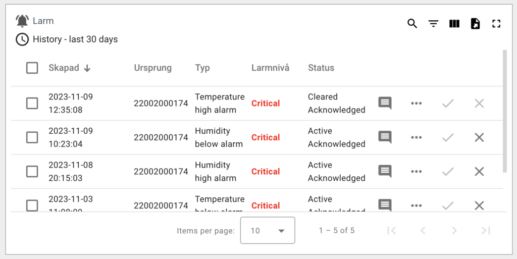 I larmwidgeten kommer detaljerad larminformation att visas om enheten detekterar att någon av sensorerna överskridit ett gränsvärde.
